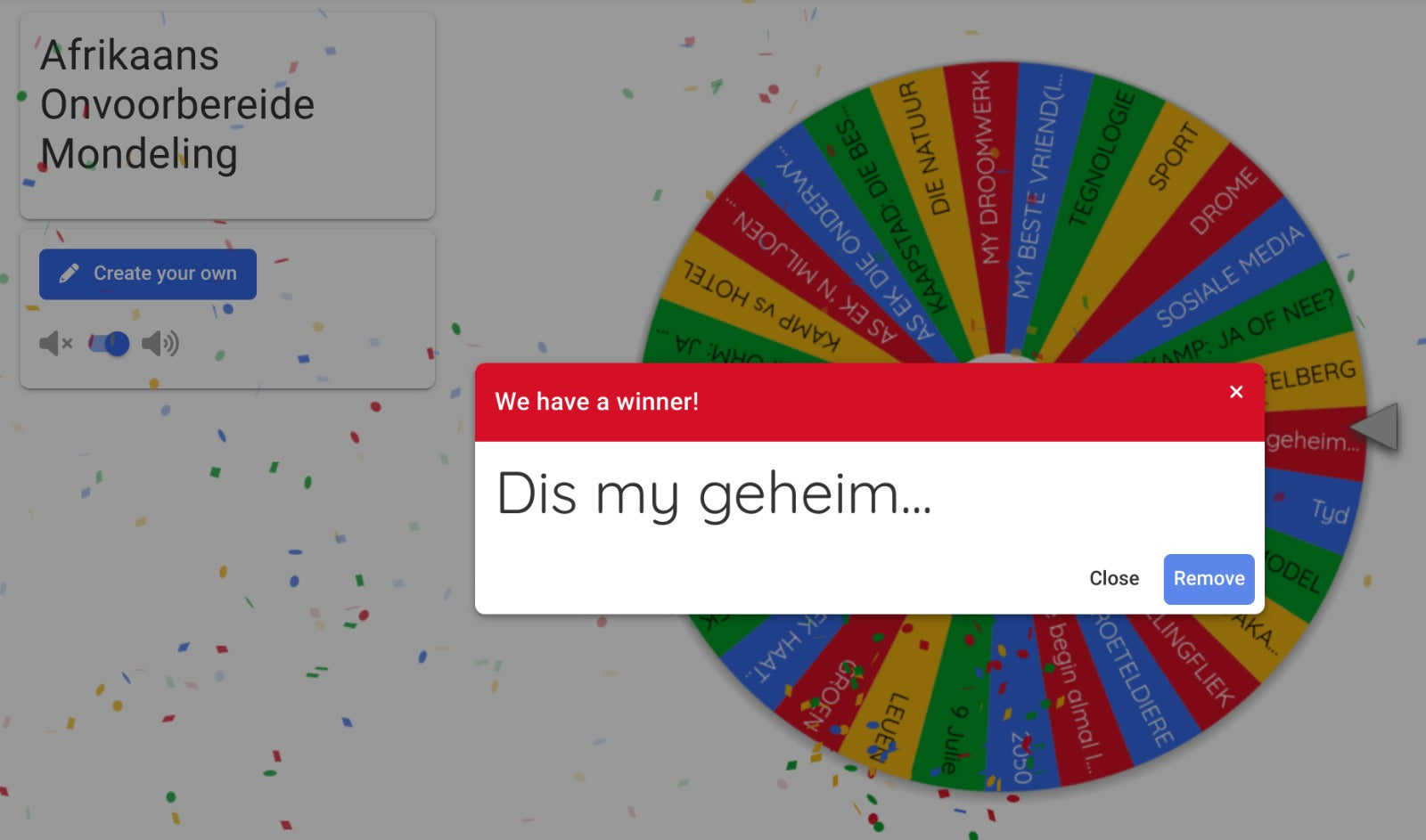 Onvoorbereide Mondeling met GROOT sukses. Deur die bank geniet die leerders dit van die swakste tot die beste. Soveel so, dat ons dit al vir lekkerte op 'n Vrydag gespeel het. Dit gaan gepaard met baie lag.